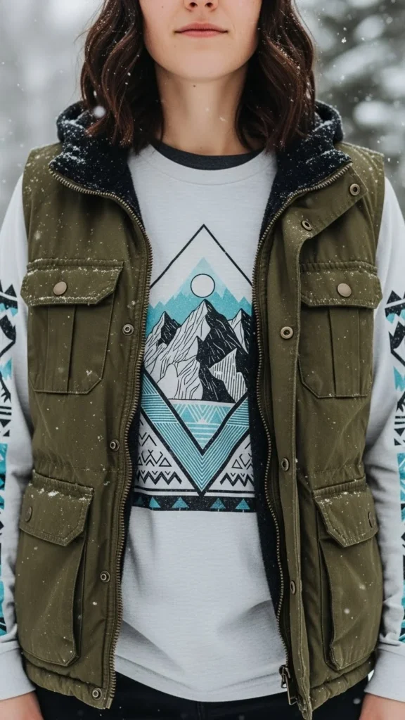 A graphic shirt adds personality. A vest tones it down slightly, keeping the look balanced. Add jeans and boots. This outfit suits weekends or casual afternoons. If the graphic shirt feels loud, choose a darker vest. Graphic long sleeves are inexpensive and easy to style under knits.