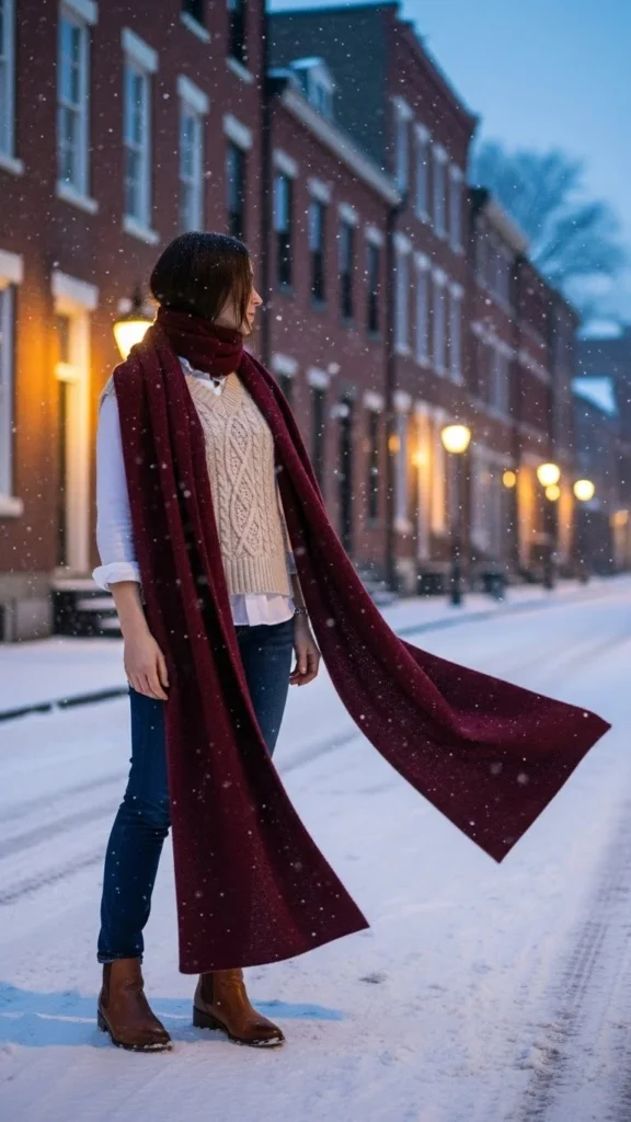A long scarf adds softness to the structured vest look. Choose a contrasting colour for interest. Add a warm coat. Wear boots or sneakers. This pairing suits outdoor tasks or casual winter days. Scarves are affordable and easy to match with basics. The vest adds warmth without overwhelming.
