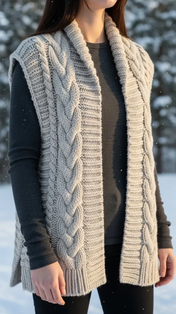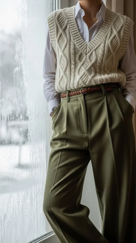 Cable patterns add visual interest. Pair them with wide-leg trousers for airflow and comfort. A fitted long-sleeve underneath balances the shape. Add boots with a bit of height. This outfit suits workdays or dinner plans. If the vest feels thick, choose a thinner base layer. Wide-leg pants are easy to thrift in neutral colours.