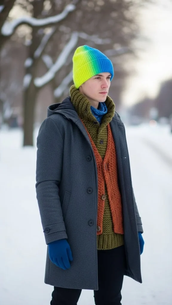 A slim coat creates clean lines over the vest. Add a fun beanie for colour. Choose boots for practicality. This outfit suits winter walks or errands. Beanies are budget-friendly and easy to coordinate. The structured coat helps balance the layered shapes beneath it.