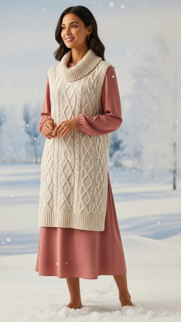 Layering a vest over a turtleneck dress creates a clean, elongated shape. Choose a slim vest to maintain balance. Add boots for warmth. This works for dinners or semi-casual settings. If the dress feels thin, add thermal tights. The vest adds dimension without adding weight.