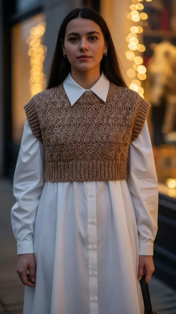 [Image Prompt: A sweater vest styled over a crisp shirt dress, photographed near glowing winter shop lights.]