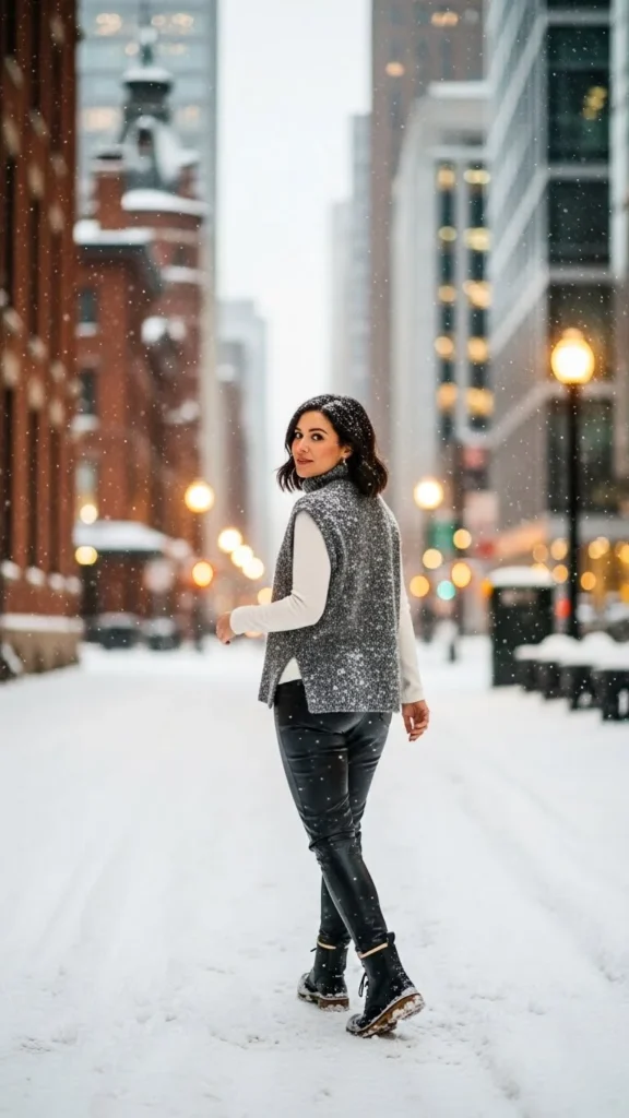 A faux-leather skirt adds edge to the softness of the vest. Pair with a fitted base top. Add winter boots. This pairing suits evening outings or casual nights. If the skirt feels cold, layer thick tights underneath. Faux-leather skirts are affordable and add texture contrast. Keep accessories minimal so the textures remain the focus.