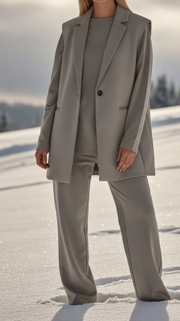 A monochrome palette keeps the outfit calm and cohesive. Choose shades of beige, grey, or black. Layer a matching turtleneck and trousers under a neutral vest. Add boots in the same colour family. This is easy to recreate with basics you already own. A structured coat completes the outfit for cold days.