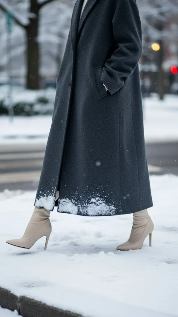Sock boots hug the ankle, which helps lengthen the line from coat to shoe. A small heel lifts the body. Pair with skirts, dresses, or trousers. This outfit suits evenings or more dressed-up outings. Sock boots can often be found in budget-friendly stores.