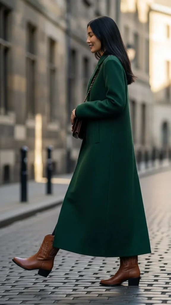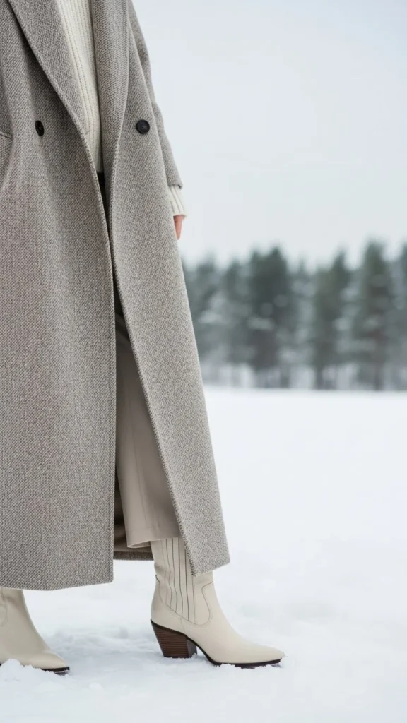 Western boots add shape to the ankle. Choose a coat in camel, grey, or black. Pair with straight jeans or relaxed trousers. Add a warm sweater. This combination suits casual winter days. Western boots are durable and easy to find.