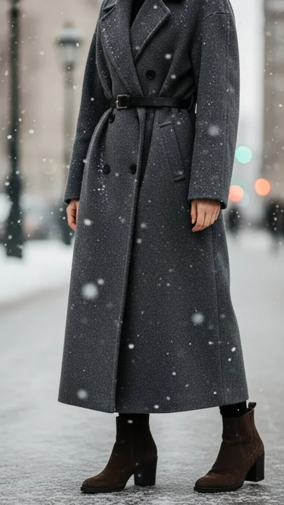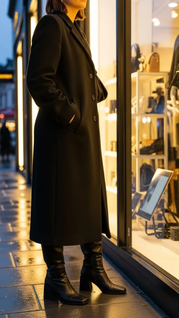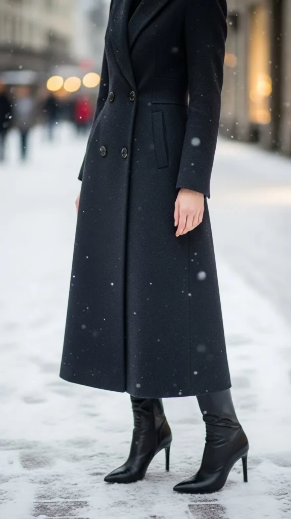 Double-breasted designs add structure. Minimalist boots keep the bottom half clean. Choose tailored trousers for balance. Add neutral layers underneath. This look works for office days and polished winter routines. Keep accessories simple so the shape stays clear.