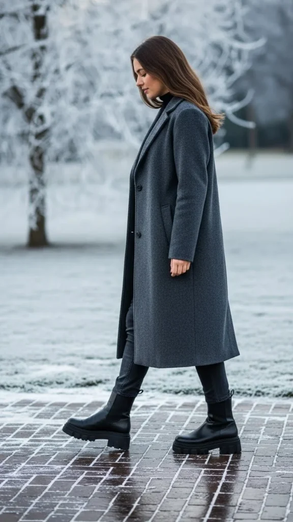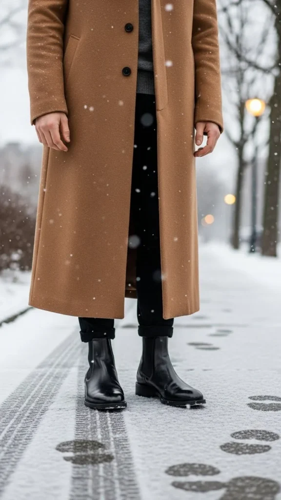 Chelsea boots create a sleek profile. A long coat amplifies vertical length. Pair with dark denim or wool pants. Add a turtleneck or crew-neck knit. This outfit works for everyday winter wear. Chelsea boots are timeless and easy to maintain.