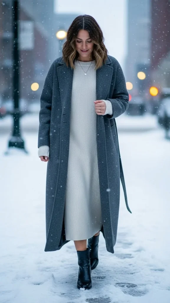 A knit dress creates one smooth line underneath the coat. Boots anchor the look. Add tights for warmth. This pairing suits chilly outings or date nights. Knit dresses are widely affordable in winter months.