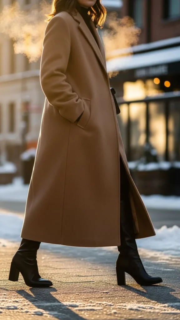 Camel tones brighten winter outfits while keeping the look soft. A block heel adds subtle height and stability. Pair with straight jeans or wool trousers. Add a turtleneck in cream, brown, or black. This combination suits workdays or afternoon plans. Camel coats are widely available, and block-heel boots can be found in budget shops. A clean crossbody bag completes the look without interrupting the vertical lines.