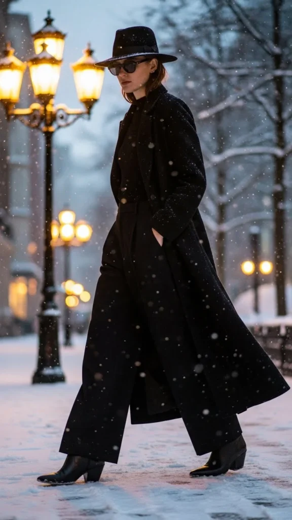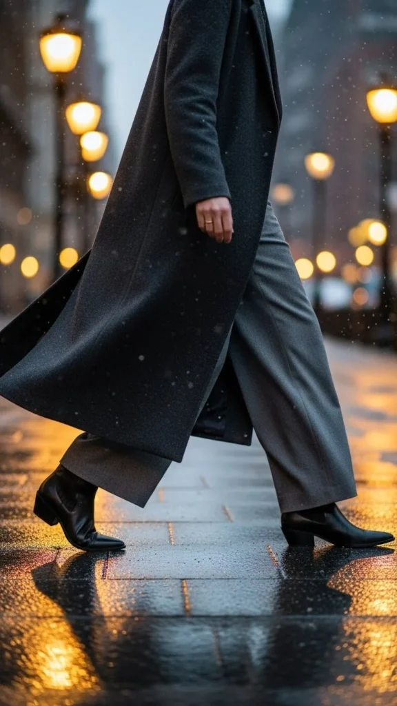 Wide-leg pants move softly under a long coat. Pointed boots sharpen the finish. Pair with a slim turtleneck to balance movement. This outfit suits winter evenings. Keep patterns minimal so the silhouette remains clean.