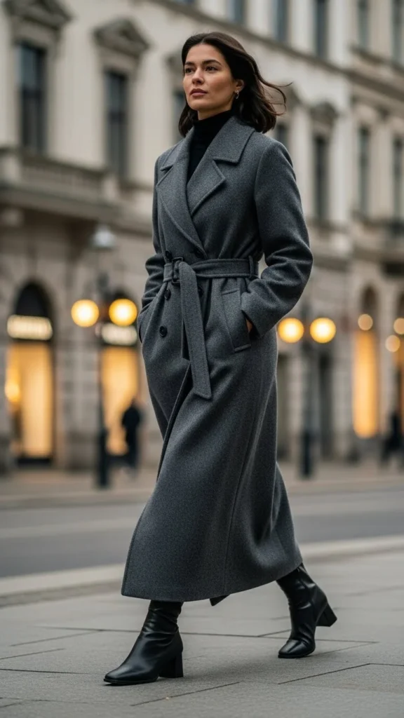 3. Belted Grey Maxi-Coat + Sleek Leather Boots