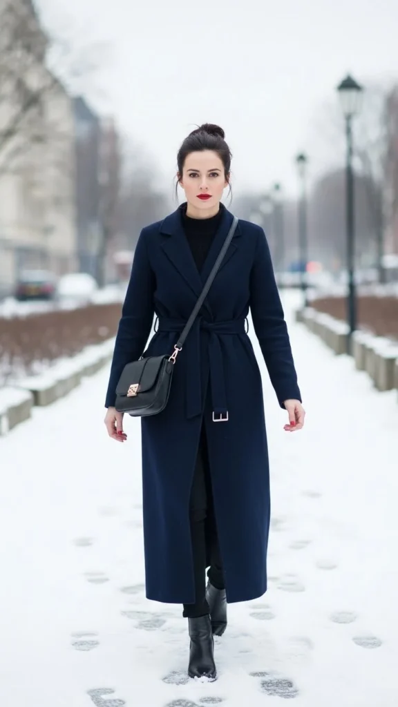 Navy and black create quiet depth. A long coat darkens the outline, adding height. Wear slim trousers or leggings. Add a black knit for cohesion. This pairing works for day-to-night winter plans.
