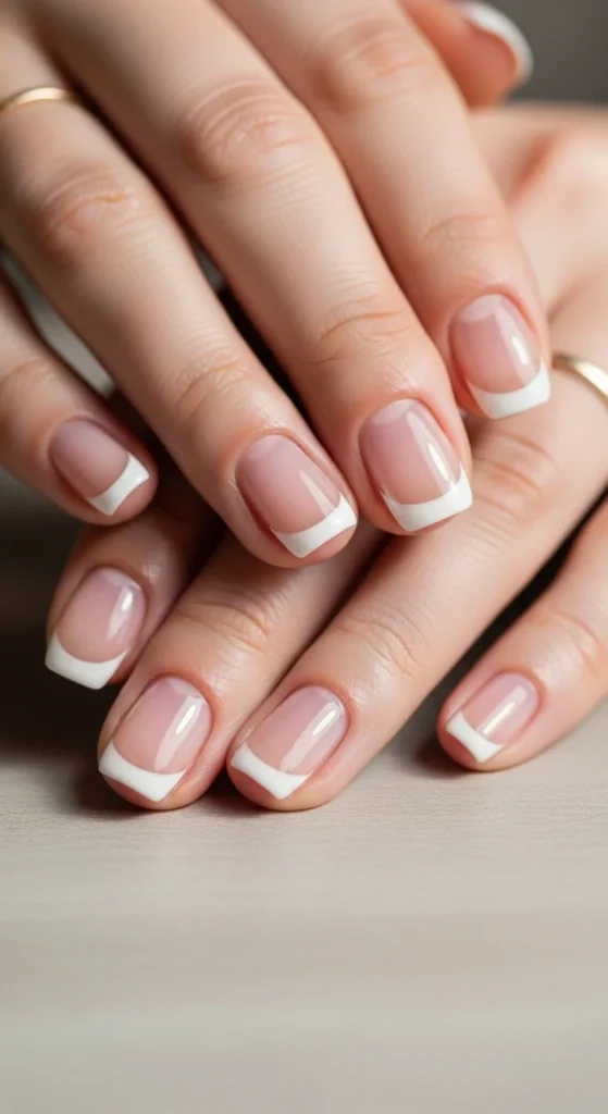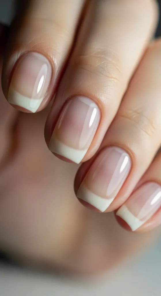 Micro white tips keep the French style subtle. The white line is thin and close to the edge.