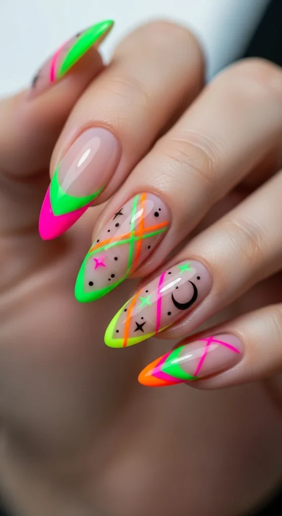 Neon French tips are a playful way to make a statement without going full neon. Try diagonal tips, outline tips, or even a tiny celestial accent on one nail. These designs are easy to do with a steady hand and some striping tape. Pick contrasting colors like electric yellow on a soft pink base for maximum pop. Perfect for work or casual outings, French tip variations are a beginner-friendly option that still feels vibrant and trendy.