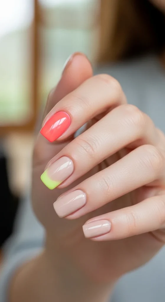 Not ready for full neon coverage? Try one accent nail. Paint a single nail in neon yellow, pink, or green while keeping the others neutral. This approach is easy to do at home and adds a pop of color without being overwhelming. It’s a simple, budget-friendly way to test neon trends. Accent nails pair beautifully with rings and casual outfits.