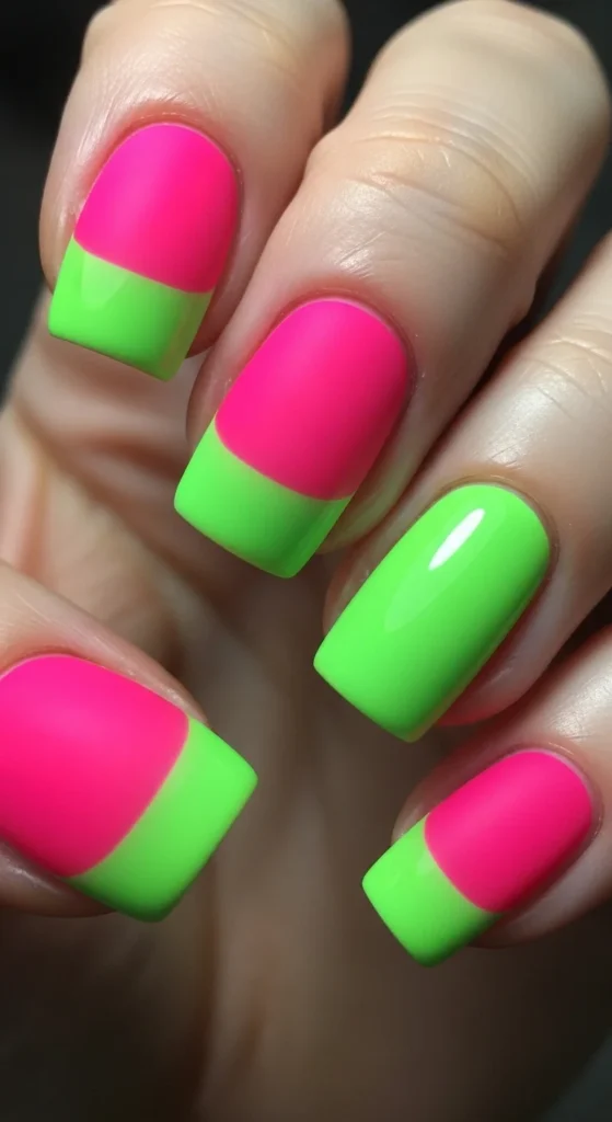 Matte or glossy? Both finishes have their charm. Matte neon looks soft and edgy, while glossy neon shines and reflects light. Try mixing both on the same hand for a dynamic effect. Matte topcoat is inexpensive and easy to apply at home. Switching finishes is an affordable way to experiment with texture without buying new polish.