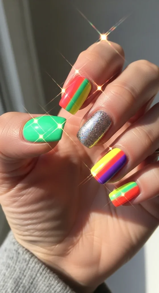 Add a bit of sparkle to your neon skittles for extra fun. Pick one or two nails for glitter accents while keeping the rest solid neon. Glitter nail polish or loose pigment works for DIY application. This design is playful, quick, and perfect for parties or festival-ready looks. It also adds dimension without complicated techniques.