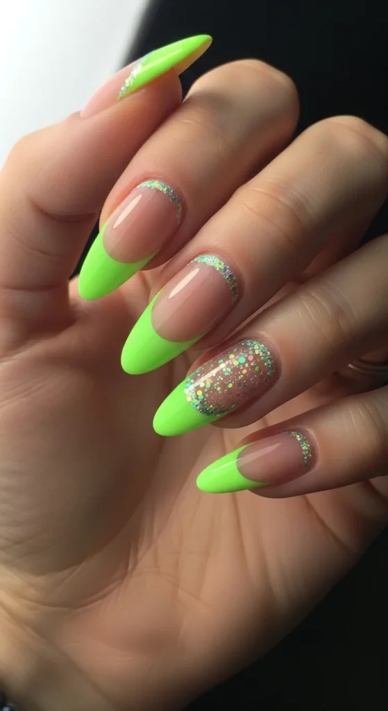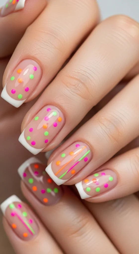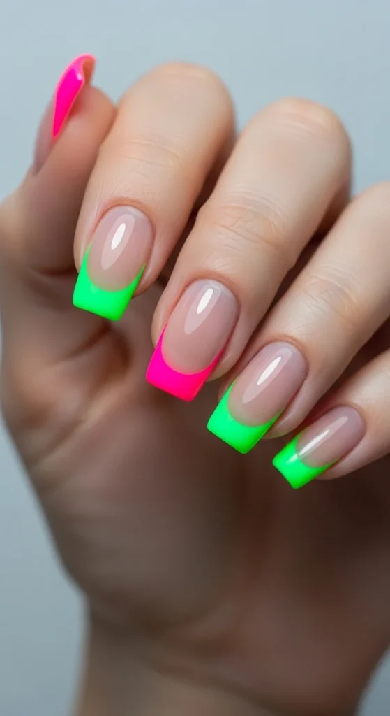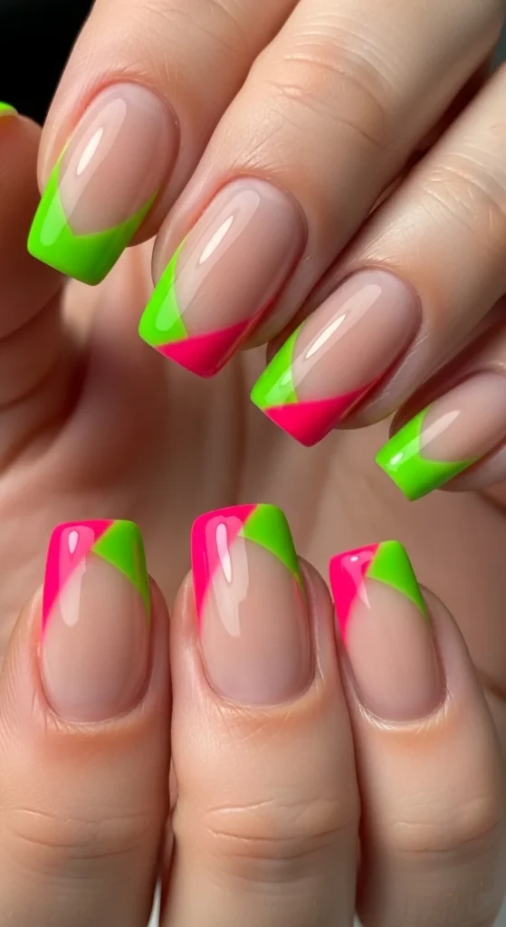 Diagonal French tips add a twist to the classic style. Instead of straight horizontal lines, paint neon tips diagonally across your nails. This creates movement and visual interest. Beginners can use striping tape or nail guides to keep lines clean. Try mixing two neon shades for extra pop. Diagonal tips work on short and long nails, making them versatile. Add a thin glitter line along the diagonal for sparkle without overwhelming the design. This look is playful yet polished and perfect for casual weekends or summer events.