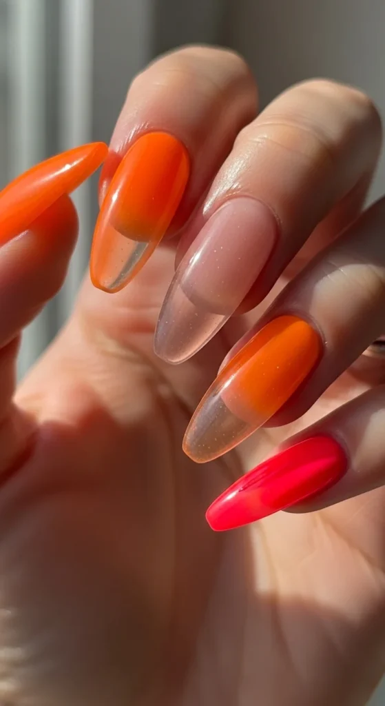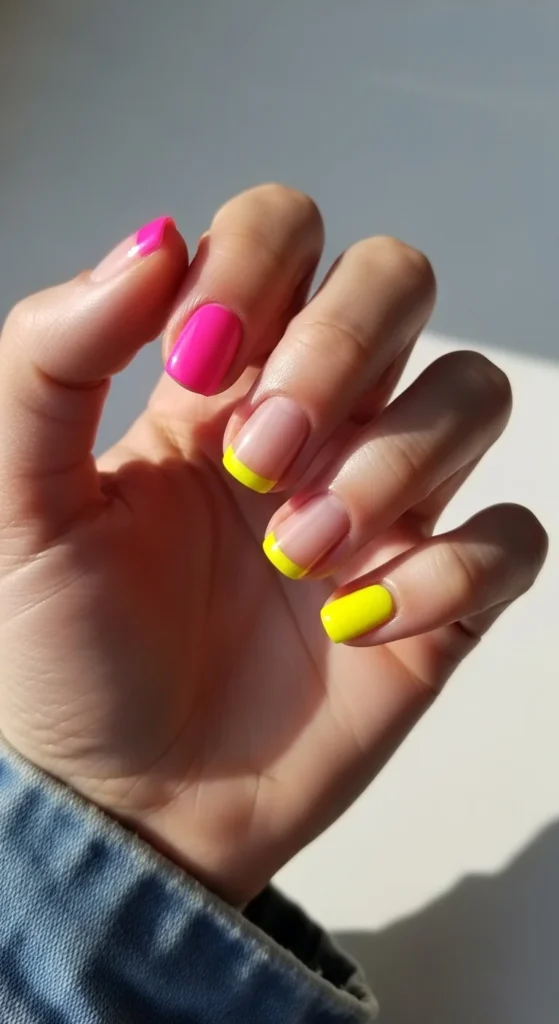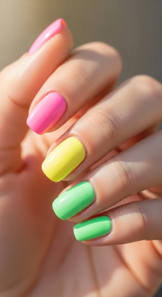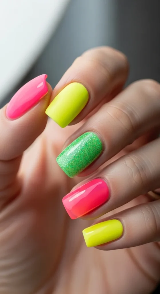 Mix finishes for texture and interest. Try one matte nail, one glossy, one shimmer, and one jelly. Neon colors look different depending on finish, giving your manicure depth. Mixing finishes is simple with standard polishes and topcoats. It’s an easy way to elevate DIY neon nails at home.