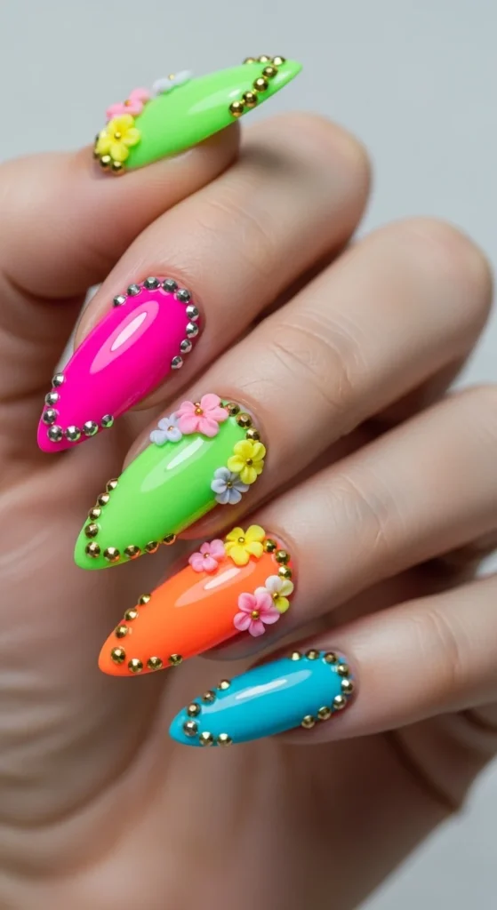 Add dimension with 3D accents like tiny flowers, studs, or pearls. Keep the base neon simple to let accents stand out. You only need a few DIY-friendly embellishments and nail glue. 3D neon nails feel premium without a salon visit. Perfect for birthdays, photoshoots, or fun weekend looks.