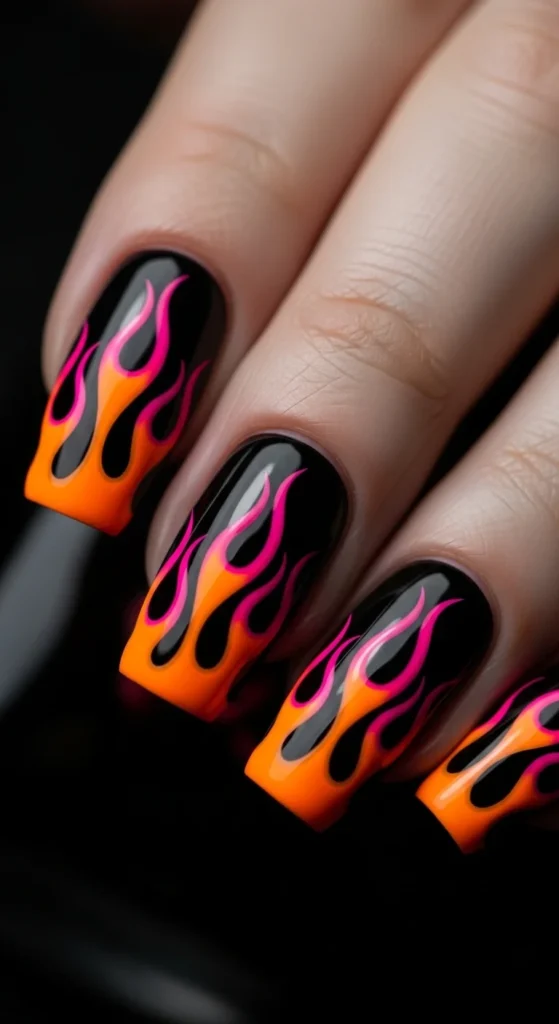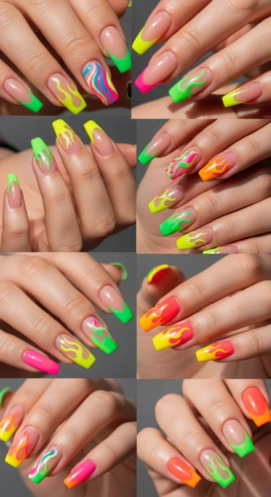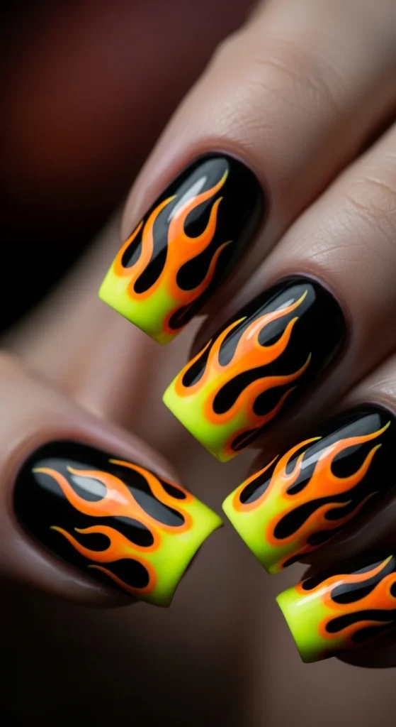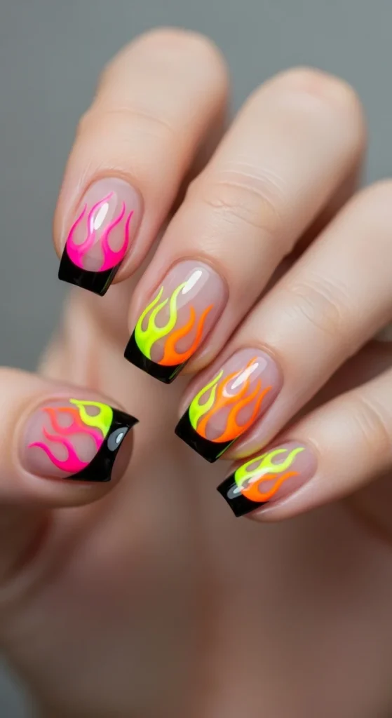 Flames are a classic statement. Neon flames over a dark base instantly catch the eye. Start with a black or deep purple base, then layer neon oranges, pinks, and yellows in flame shapes. You can keep it simple with accent nails or go full-on fiery on every finger. Flames pair well with short or long nails, giving a bold vibe without feeling overwhelming. Easy DIY trick: a thin brush or toothpick creates clean flame edges.