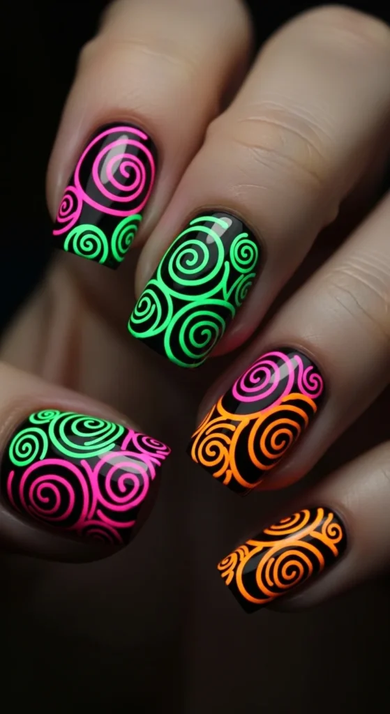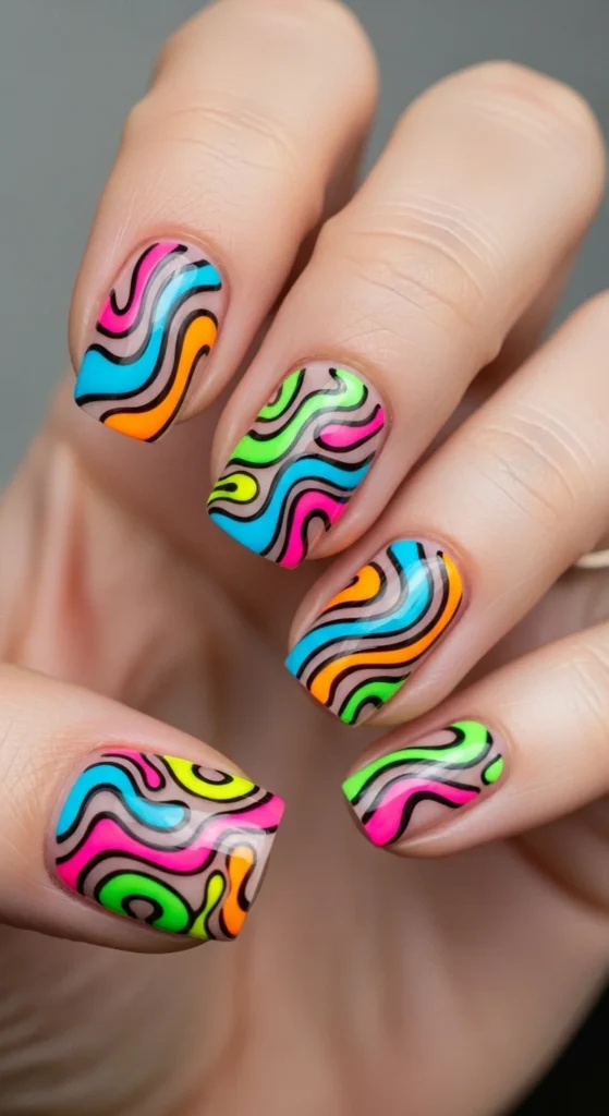 Abstract neon swirls add an artistic flair to your manicure. Use a black or nude base to make bright colors pop. A toothpick or thin brush can help you swirl neon polishes together for a marbled effect. These designs are surprisingly simple but look sophisticated. Ideal for DIY enthusiasts, swirls let you mix multiple neon shades in playful, energetic patterns. Quick-dry topcoat keeps them looking fresh all week.