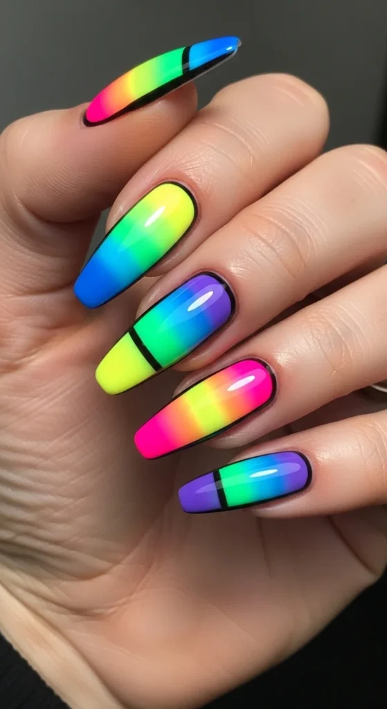Combine rainbow gradients with black outlines for a striking, graphic manicure. Start with a nude base and blend neon pink, yellow, green, and orange for a gradient effect. Once dry, outline each segment with black polish or gel to define the shapes. This approach creates a modern, editorial feel without needing complicated tools. It’s beginner-friendly: use a small brush or striping tape for clean lines. Perfect for festivals, parties, or summer photo shoots, this style mixes multiple neon shades while keeping the manicure polished and visually cohesive.