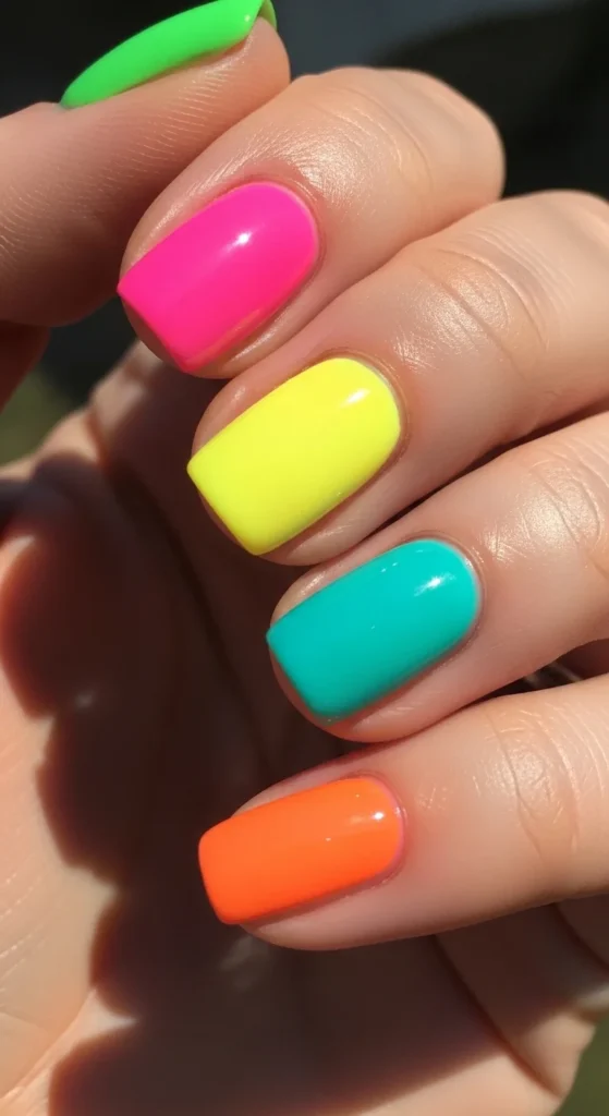 Rainbow skittle nails are fun, playful, and beginner-friendly. Assign each nail a different neon color for instant vibrancy. This design works well on short nails and is great for experimenting with new shades. For easy cleanup, use a base coat and dotting tool for precise application. Perfect for festivals or casual weekends, these nails are an easy way to enjoy multiple neon colors without a complicated design process.