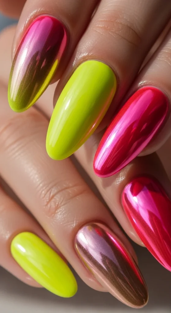 Combine two trends: neon flames and chrome. Start with a dark base, add chrome powder for reflection, and layer neon flames. The result is dramatic yet wearable. Chrome powder kits are inexpensive and beginner-friendly. This style is bold, eye-catching, and perfect for festival looks.