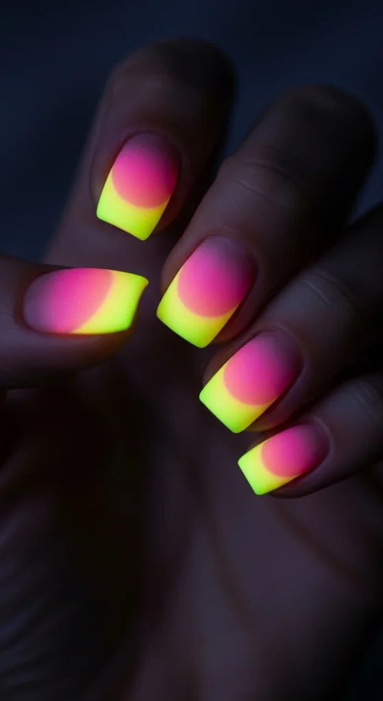 Gradients soften neon for those who want a bright but gentle look. Blend neon pink, yellow, and green for a smooth ombré effect. Use a sponge for DIY at home—it’s cheap and effective. Gradient nails feel cheerful and wearable for everyday outfits. Combine with minimal line art for extra personality.