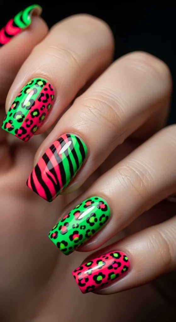 Animal print meets neon for a bold, textured look. Zebra stripes, leopard spots, and snake accents work well with bright colors like lime, pink, or orange. These designs are fun for beginners—start with a neutral base and layer neon patterns. Add a matte or glossy topcoat to play with finish contrast. Perfect for party nails or playful everyday looks.