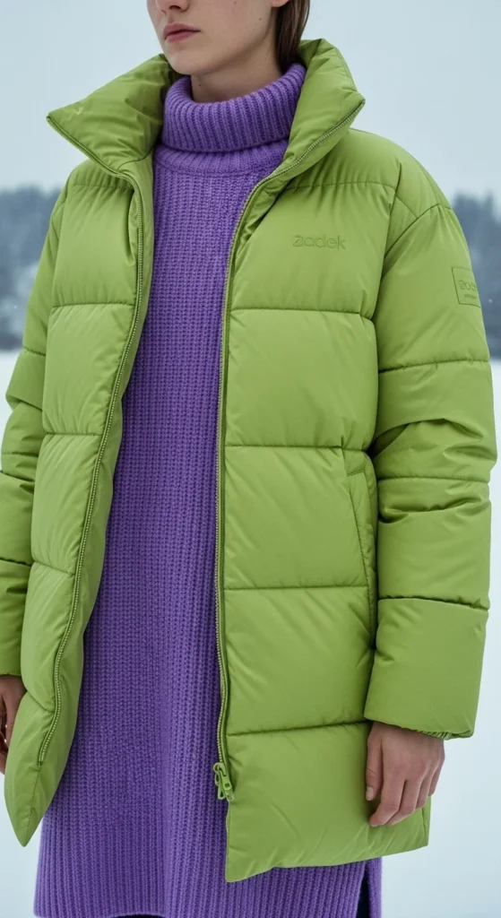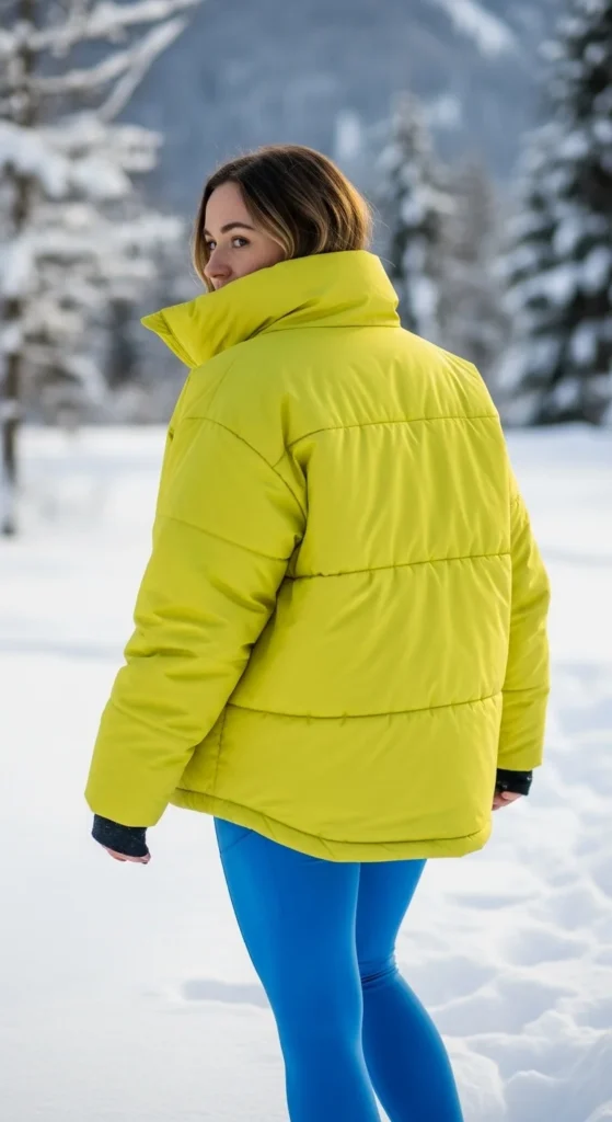 A bright yellow puffer instantly stands out, especially paired with electric-blue leggings. This combo is comfortable, warm, and easy to recreate. Choose leggings with a matte finish so the puffer remains dominant. Add a white beanie and gloves for a clean winter look. If you want to switch it up, use a crossbody bag in fuchsia or green. This outfit is perfect for casual outings and energetic days.