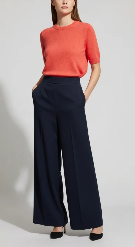 A coral knit top paired with navy palazzos feels bright without being overwhelming. The wide-leg shape makes the outfit comfortable for long events. Add a slim belt if you want more definition. A denim jacket adds a relaxed touch. For a quick DIY idea, crop an old sweater into a neat knit top. Simple sandals or boots work well depending on the weather. A tote bag in white or beige keeps things balanced.