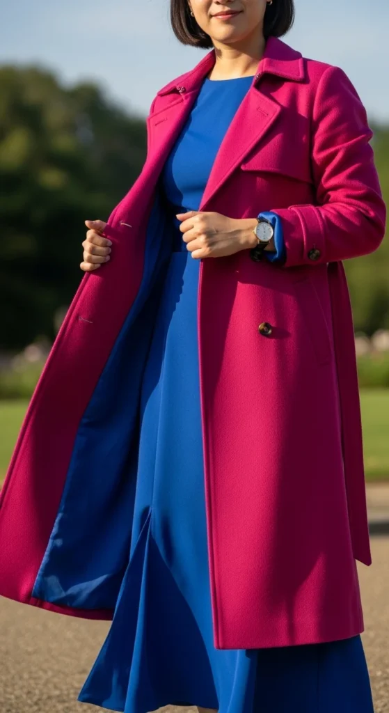 A fuchsia coat over a royal-blue dress makes a bold statement. Keep the dress clean and simple so the coat shines. Add black tights for warmth. Metallic accessories pair well with this combo. If your coat feels too long, get a quick hem for better shape. This outfit works well for dinners, parties, and holiday events.