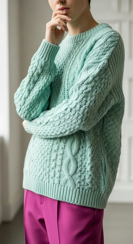 Mint and magenta create strong contrast without feeling harsh. Choose a sweater with soft texture. A tucked front helps define your shape. Add white sneakers or silver heels depending on the plan. A mini bag in dark green works surprisingly well here. This look is affordable and easy to adapt.
