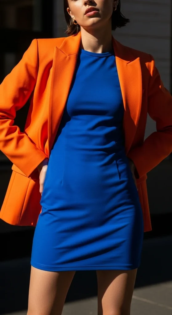 An orange blazer adds energy to a cobalt mini dress. Keep the dress simple so the blazer leads the outfit. A thin belt helps add structure. You can find cobalt dresses easily in thrift shops. Add ankle boots for winter or sandals for indoor parties. A tiny clutch in neon green brings extra contrast.