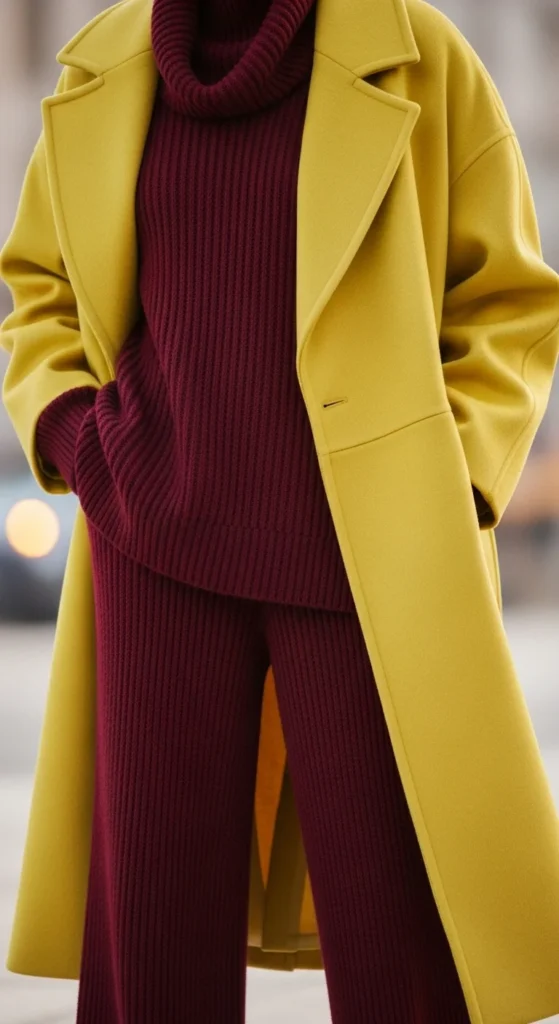A lemon coat paired with a burgundy knit set feels warm and lively. Keep the set fitted so the outer coat doesn’t overwhelm it. A pair of tall boots in black or brown completes the look. Add a scarf in beige or rust. This is an easy way to reuse knit sets you already own.