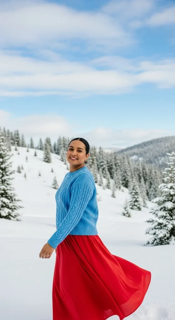 A sky-blue sweater softens the boldness of a red midi skirt. The contrast feels lively without being too strong. Choose boots in white or black. Add a crossbody bag in pink or yellow. Roll the sweater sleeves for a relaxed shape. This look works well for brunches and casual gatherings.