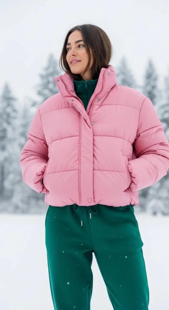 A pink puffer with green joggers creates a relaxed but energetic outfit. Choose joggers with a tapered leg for shape. Add chunky sneakers for a sporty touch. A small crossbody bag completes the look. If you want to sharpen the style, add a fitted top under the puffer. This combo works well for busy days.