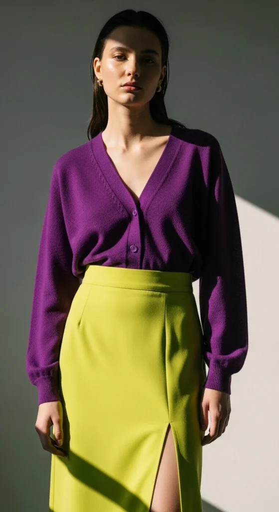 Purple and yellow balance each other beautifully. A slit skirt adds movement. Pair with simple heels or flats. Add a thin belt to shape the cardigan. A small shoulder bag in a contrasting shade like mint adds interest. This combo works for daytime events and casual parties.