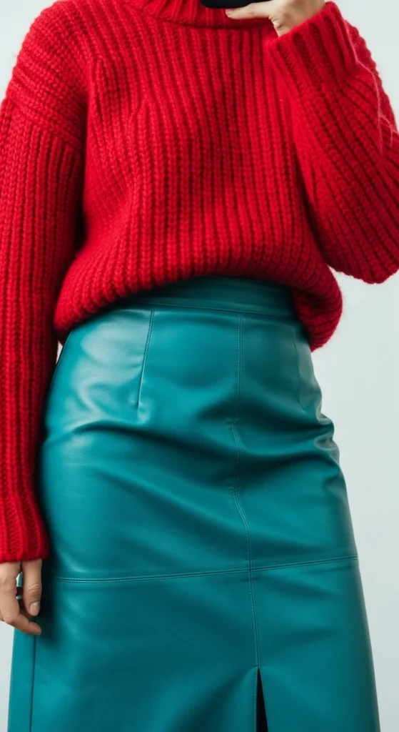 A red sweater paired with a teal leather skirt creates a clean and striking mix. Keep accessories simple. If the skirt feels too bold, add sheer tights to soften the look. A black bag works well here. For a thrifty hack, consider faux leather options—they look great and cost less. This outfit feels stylish without extra effort.