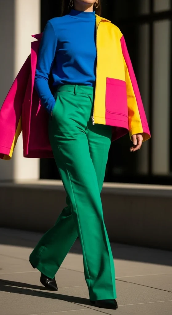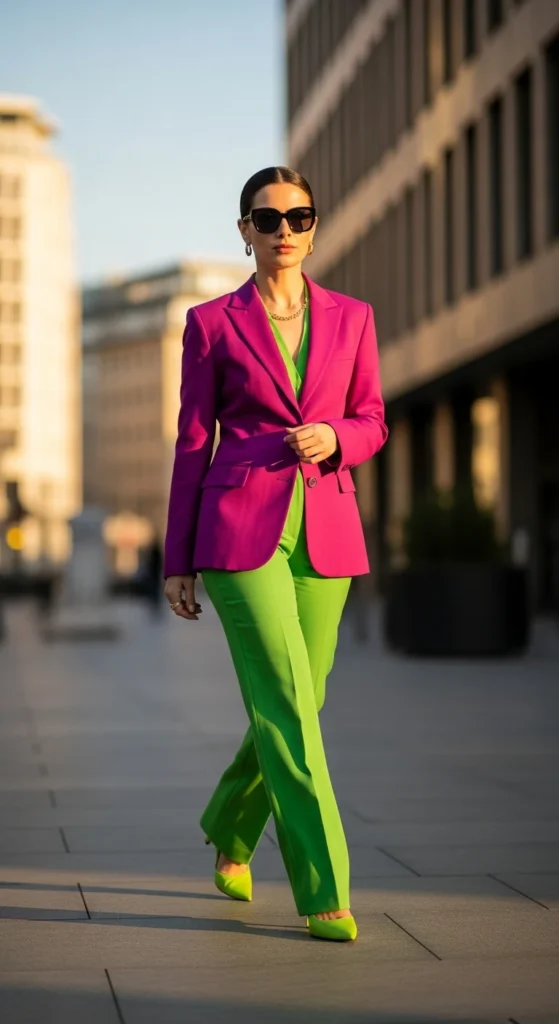 A magenta blazer with lime trousers creates instant energy. Choose tailored trousers for shape. A simple tank top underneath keeps things clean. Add neutral heels or sneakers depending on the event. If lime feels too bright, go for a softer pastel-green tone. A matching magenta purse brings balance.