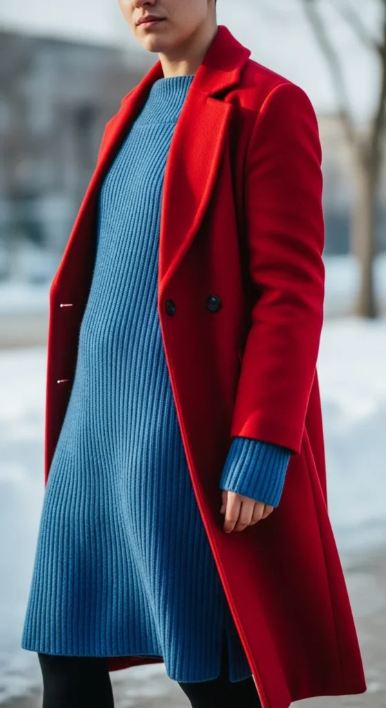 A red coat instantly lifts a blue sweater dress. Keep the coat open so the two colours layer nicely. Add tall boots for structure. A scarf in cream or tan softens the brightness. For a DIY idea, add gold buttons to your coat for extra polish. This combination works well for gatherings and outdoor plans.