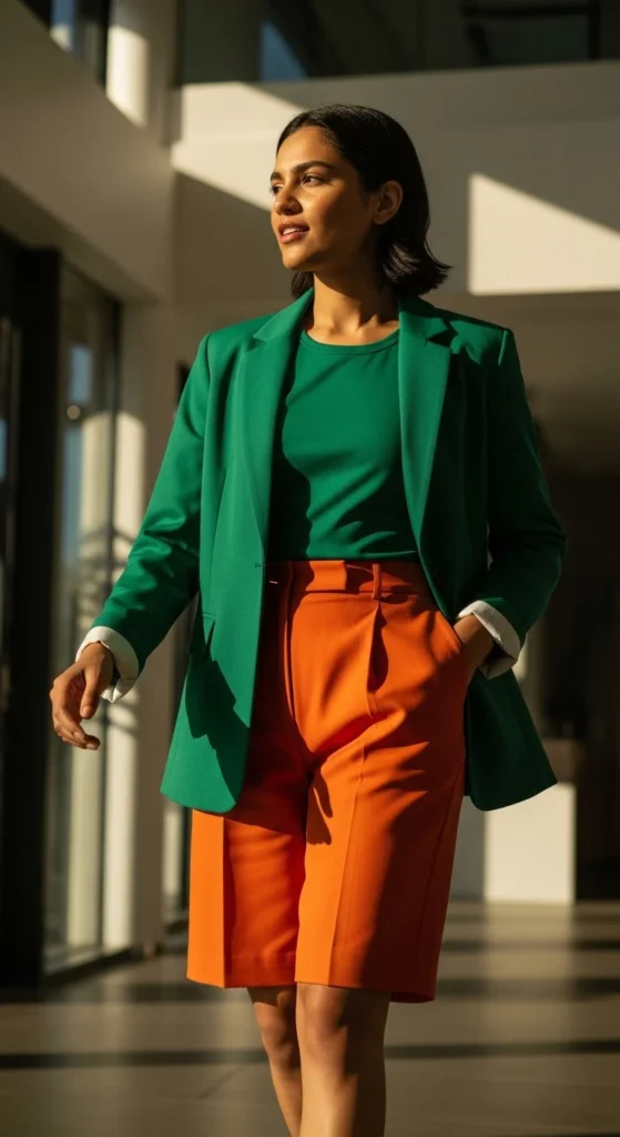 A green blazer with orange tailored shorts gives a sharp but fun look. Add a white top for balance. Sneakers or block heels work depending on your plan. A small handbag in cobalt or coral fits in well. Shorts may feel tricky in winter—just add tights. You can easily find colourful blazers in thrift stores if you’re on a budget.