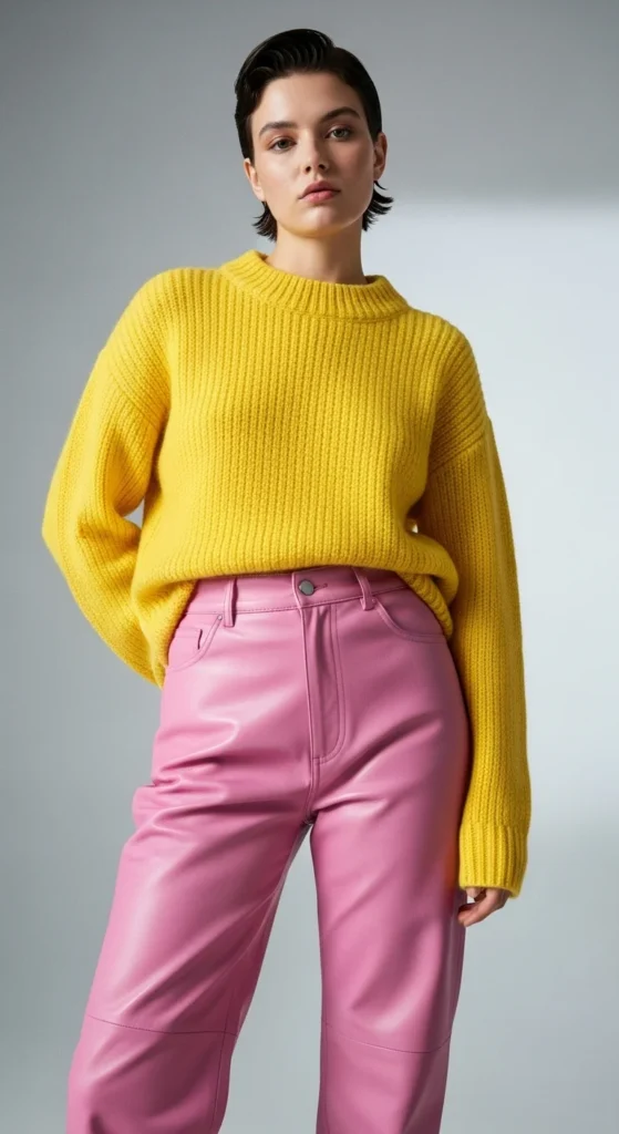 Yellow and pink create a cheerful combination. A yellow sweater adds warmth, while pink leather pants bring structure. Add white sneakers for a casual mood or block heels for an evening out. A tiny crossbody bag in red fits surprisingly well. For a low-cost trick, use faux leather pants—they look just as polished. This outfit is easy to adapt for parties and weekend outings.