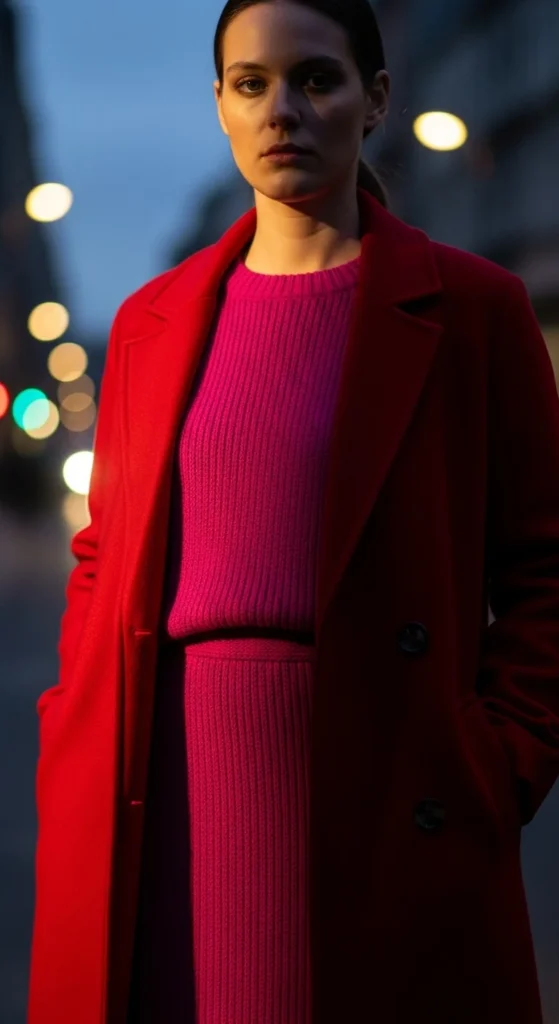 A red coat layered over a fuchsia knit set makes your outfit look intentional without feeling complicated. Keep the coat open so the colours stack visually. A simple knit top and skirt combo works well, even if budget-friendly. If you don’t own a matching set, pair a fuchsia sweater with a similar-tone skirt. Add black tights for warmth. Choose boots in a deep tone to ground everything. A soft scarf in a slightly lighter shade of pink adds depth without taking attention away. For extra structure, tie a skinny belt around the coat. This outfit feels bold while staying comfortable for long outings.