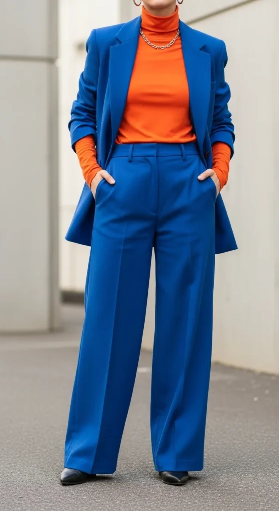 4. Orange Turtleneck With Royal-Blue Wide-Legs