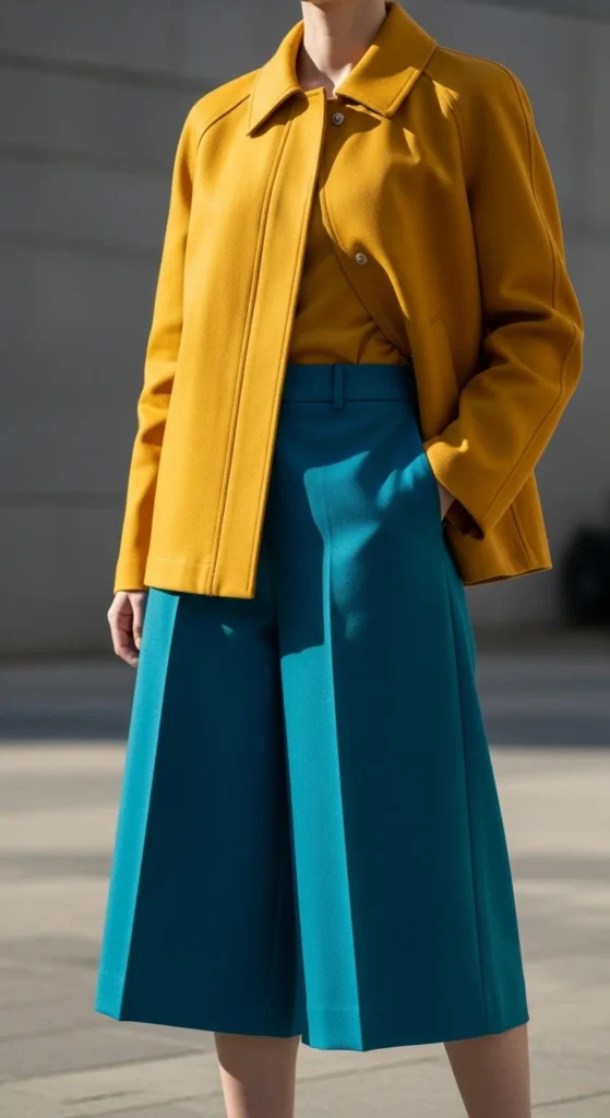 Mustard and teal create a rich combination that feels energetic. Choose culottes with a bit of movement to keep the outfit playful. A basic white or black top underneath helps balance the tones. Add sneakers for comfort or heeled boots for a polished touch. If you’re on a budget, you can easily dye a light jacket into a mustard shade. A teal bag or headband ties the outfit together. This outfit works well for casual parties and daytime events.