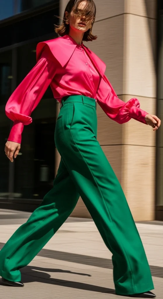 Hot-pink and forest-green create a dramatic pairing. Choose a blouse with subtle drape so the outfit feels soft. High-waisted trousers add shape without effort. If you want to soften the look, add a cream cardigan. A statement ring or simple clutch in gold or silver brings everything together. For a budget hack, turn an old green trouser pair into a deeper tone using fabric dye. This combination works well for parties and semi-formal dinners.